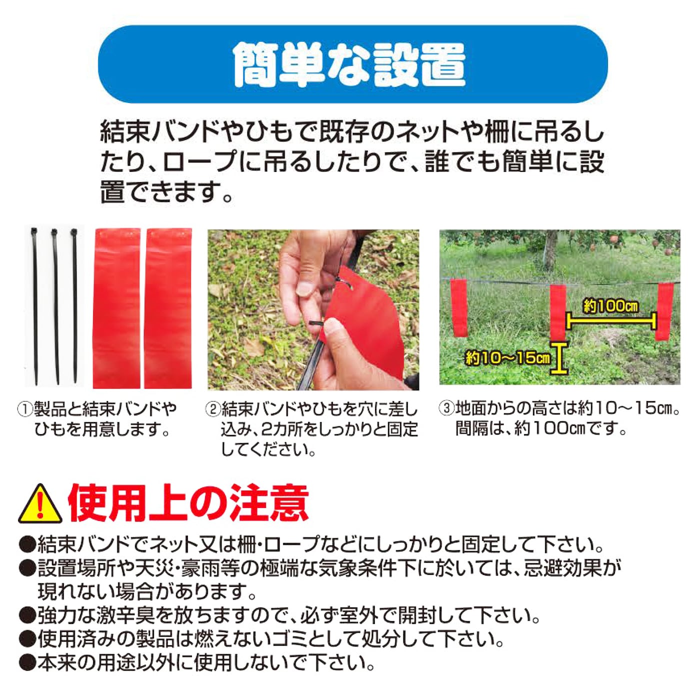 通常タイプの約2倍の強烈な臭い!『撃退タヌキ激臭シート』は、通常の『亥旦停止』シリーズの約2倍もの強烈なニオイを放つ強力タイプで、少ない枚数でも効果は絶大です!狸以外のハクビシン、アライグマ、アナグマなどにも効果が実証されています。※注:強力な激辛臭を放ちますので、必ず屋外で開封してください。
